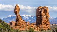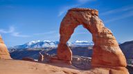Delicate Arch in the setting sun - taken in February, providing for a backdrop of snow-clad mountains.