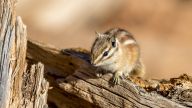 Hopi chipmunk on deadwood at the Landscape Arch observation point.